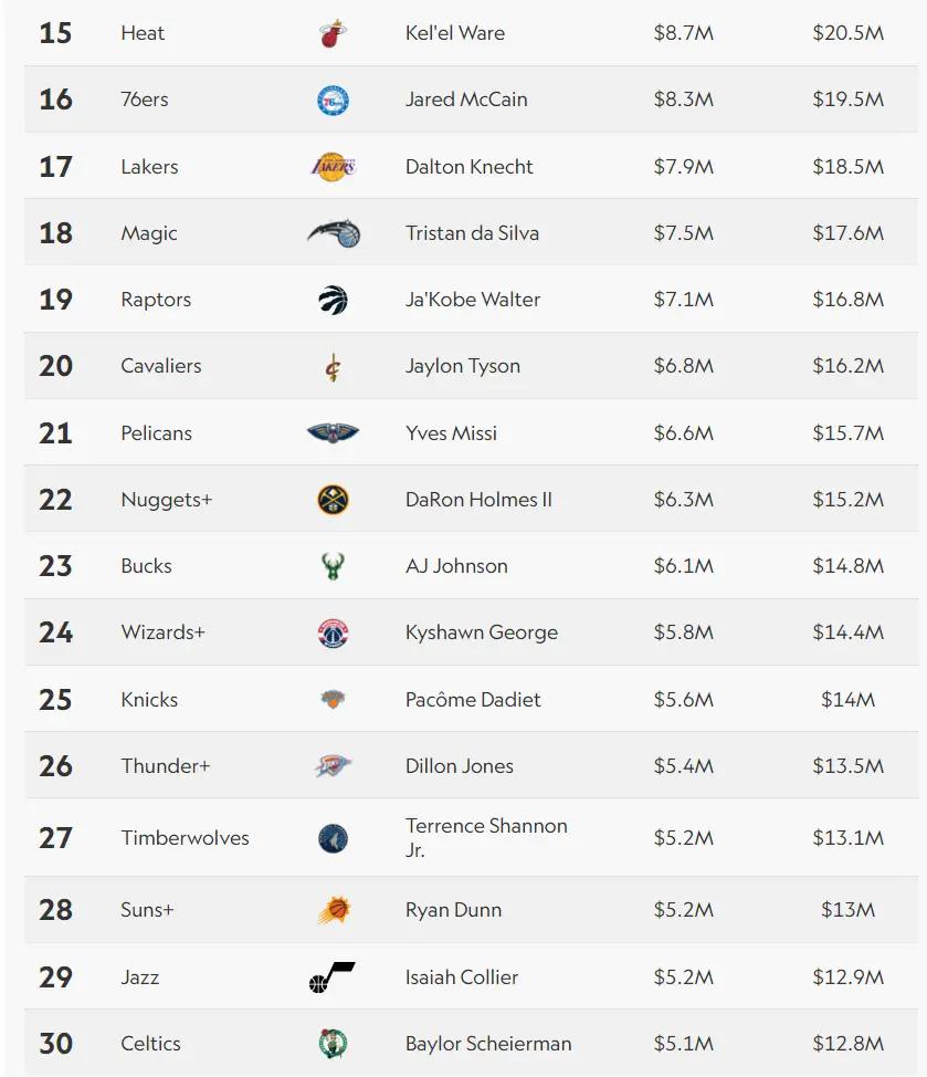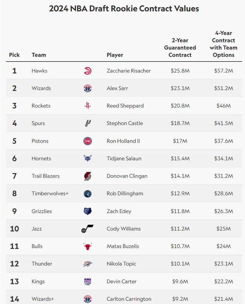 随着选秀大会的结束,这些新秀们的合同/薪水也就此出炉,里萨谢状元四年5720万,萨尔榜眼四年5120万,谢泼德探花四年4600万,卡斯尔四号秀四年450万,霍兰德五号秀四年3760万。很明显最亏的是卡姆-惠特莫尔。