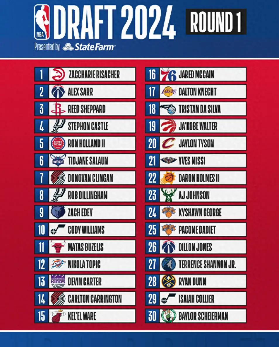 2024年NBA选秀首轮结束,老鹰状元选里萨谢,奇才榜眼选萨尔,火箭探花选谢泼德,马刺4号签选卡斯尔,活塞五号签选霍兰德。