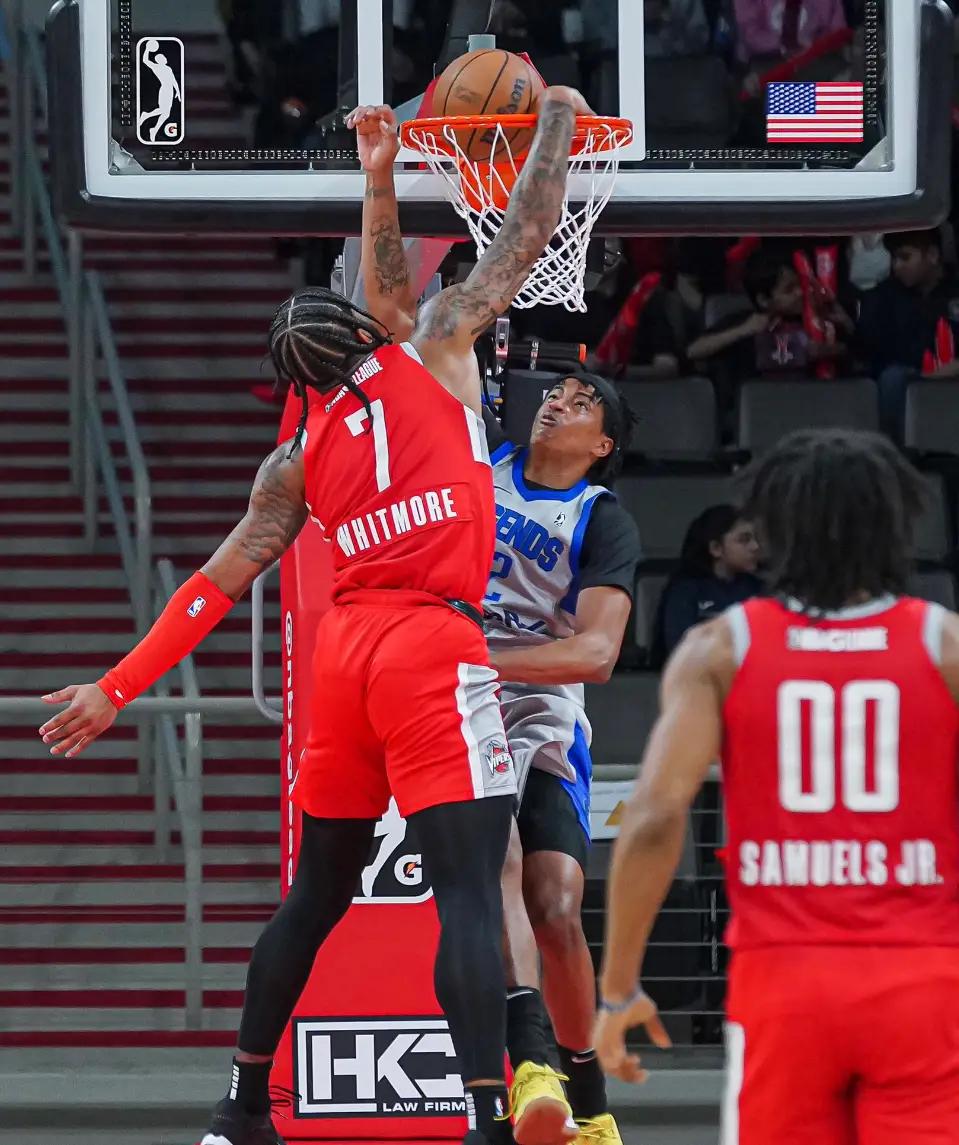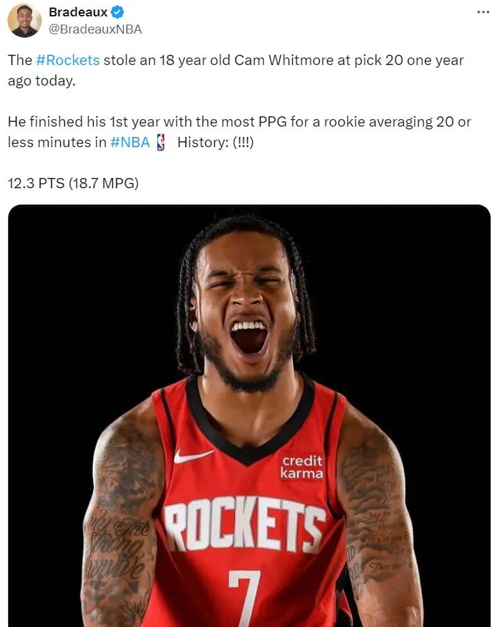 火箭媒体写道:1年前的今天火箭在选秀大会上偷走了18岁的惠特莫尔,他生涯第一年就以场均不足20分钟拿到12.3分创新秀纪录。