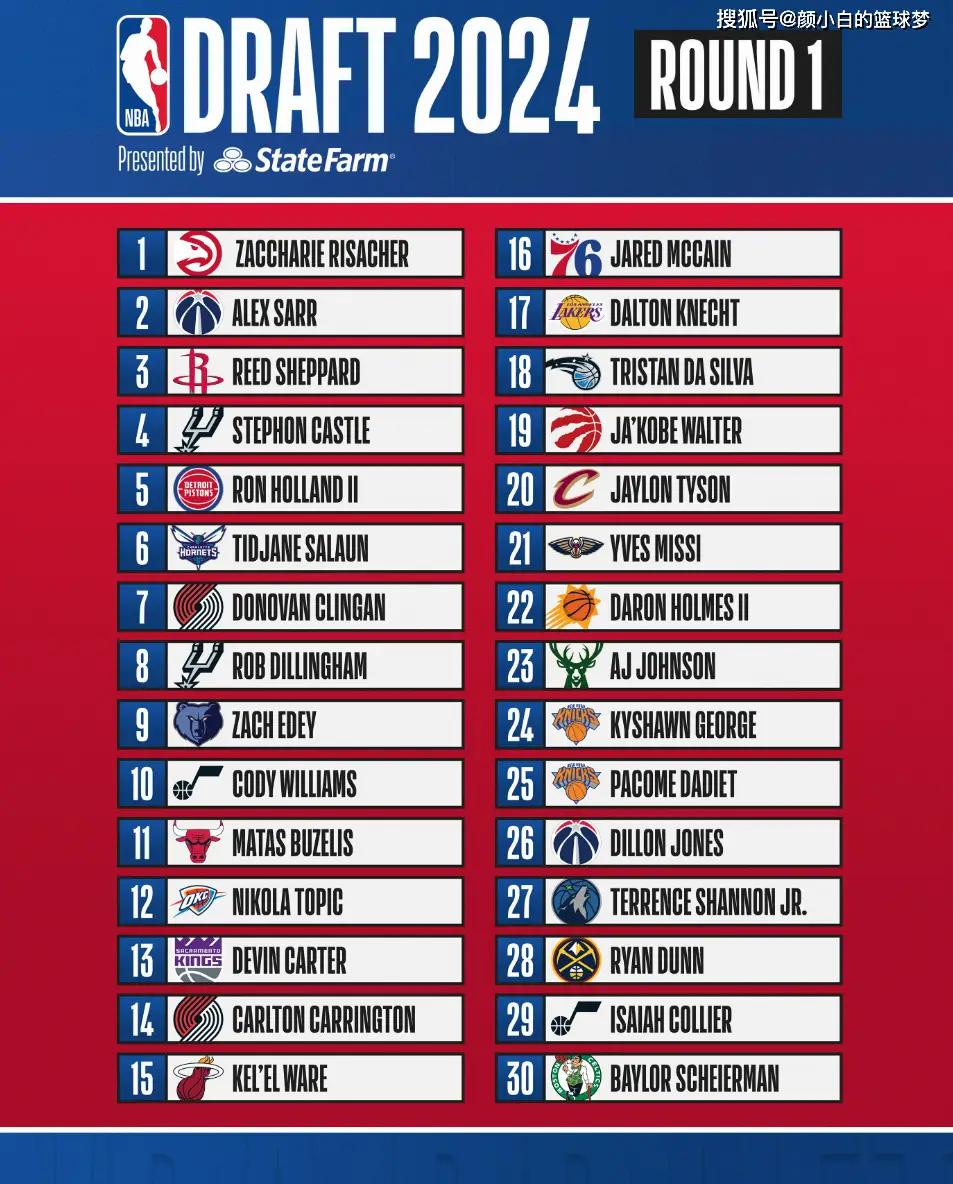 2024年NBA选秀首轮结束,老鹰状元选里萨谢,奇才榜眼选萨尔,火箭探花选谢泼德,马刺4号签选卡斯尔,活塞五号签选霍兰德。