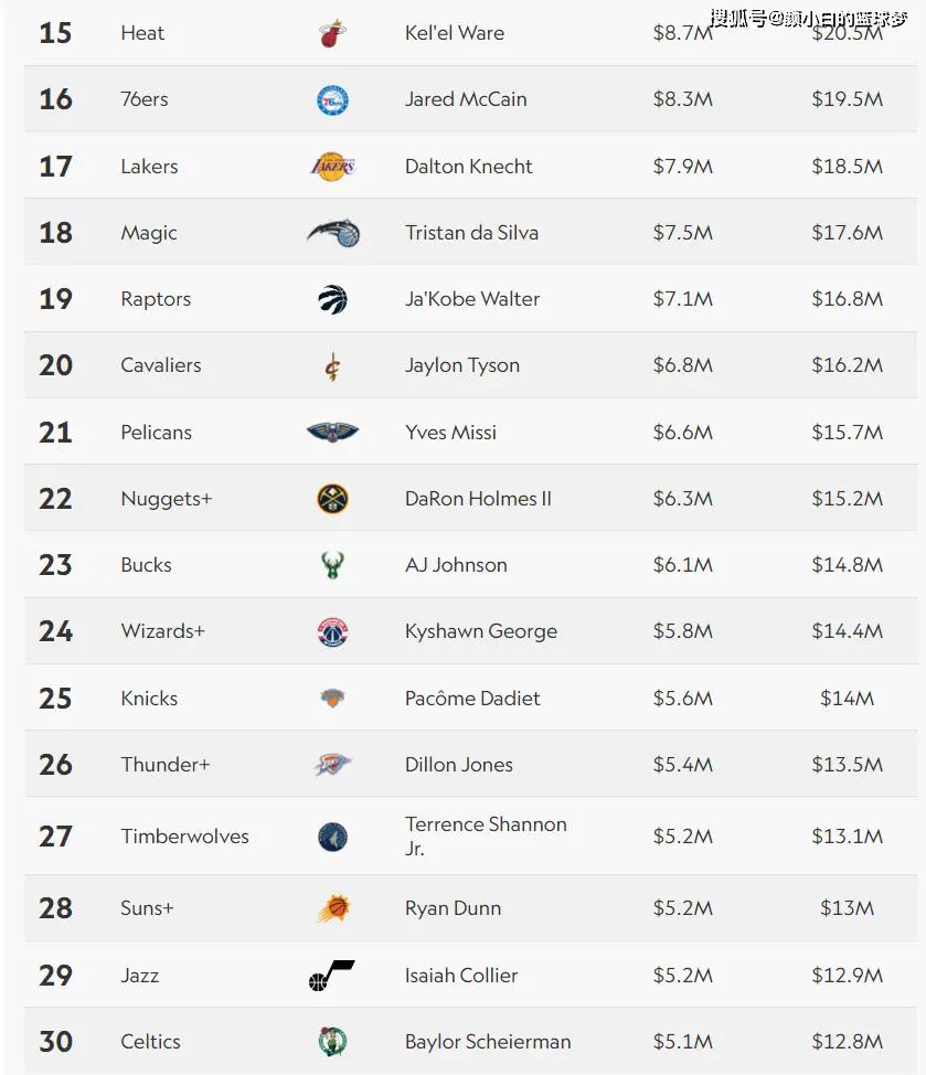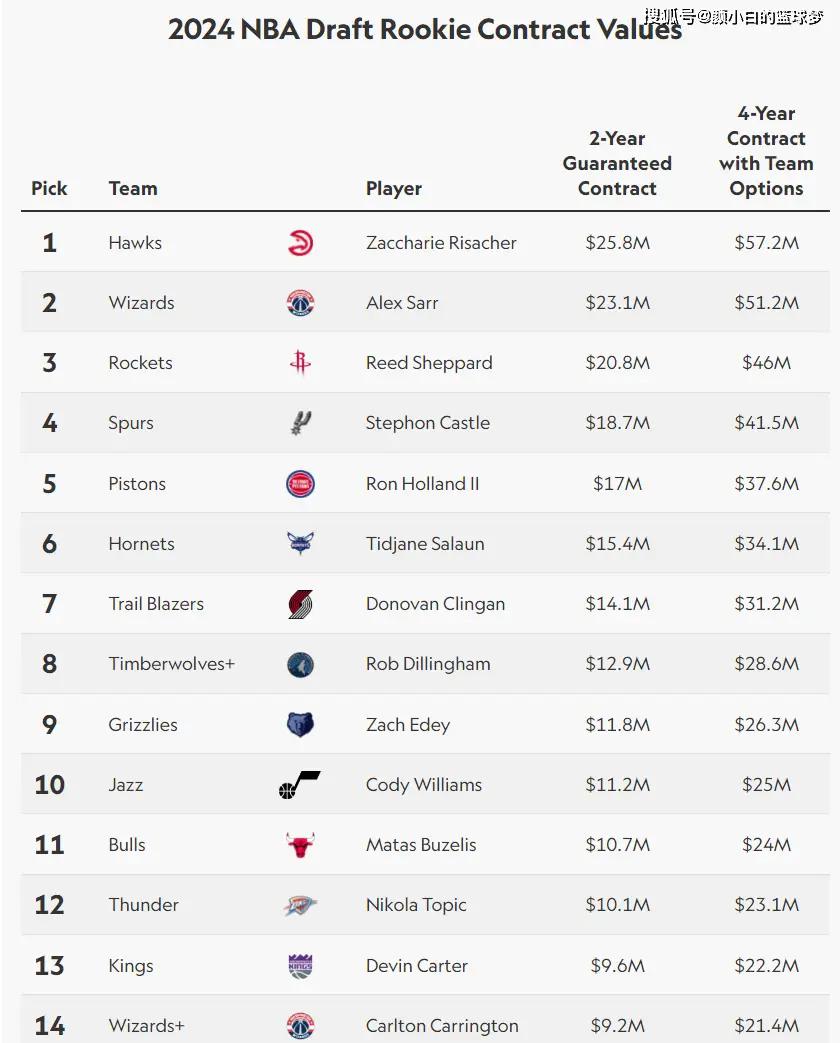 随着选秀大会的结束,这些新秀们的合同/薪水也就此出炉,里萨谢状元四年5720万,萨尔榜眼四年5120万,谢泼德探花四年4600万,卡斯尔四号秀四年450万,霍兰德五号秀四年3760万。很明显最亏的是卡姆-惠特莫尔。