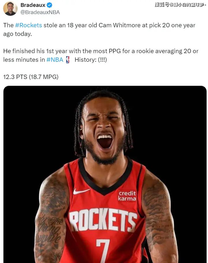 火箭媒体写道:1年前的今天火箭在选秀大会上偷走了18岁的惠特莫尔,他生涯第一年就以场均不足20分钟拿到12.3分创新秀纪录。