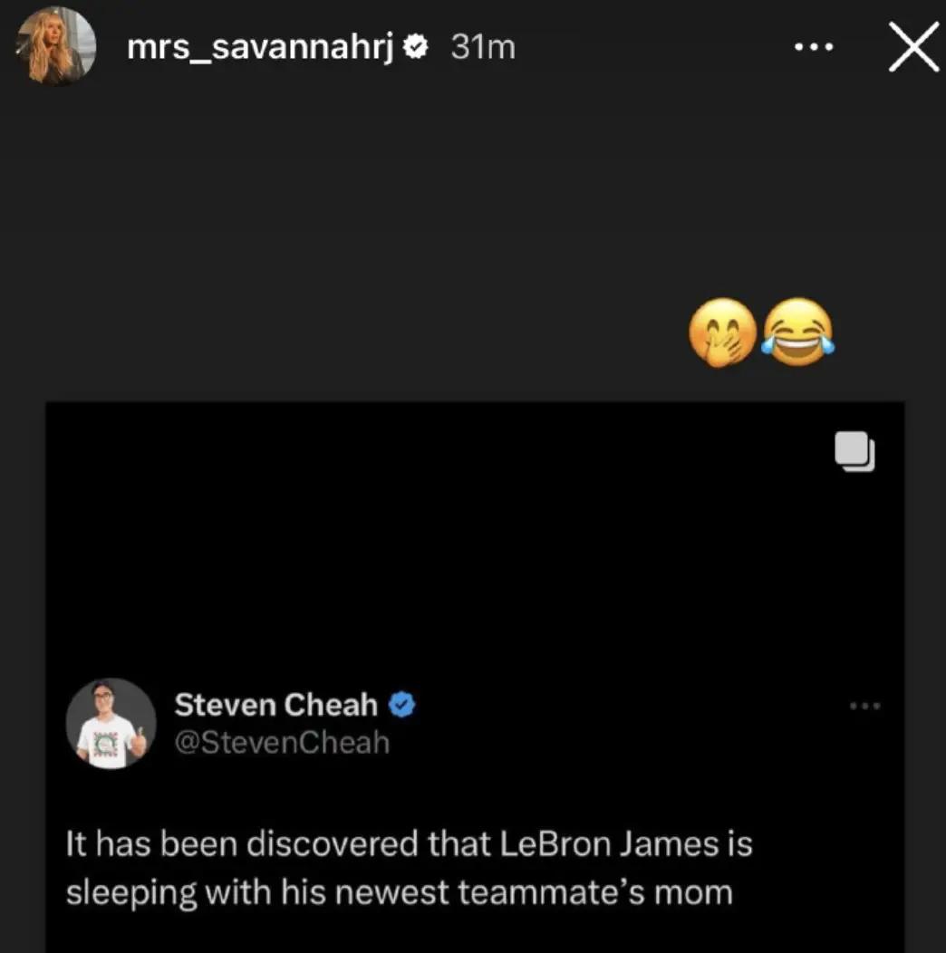 昨天有句话整得轩然大波,“詹姆斯与队友母亲有染”,这句话咋一看,大家肯定以为是黑子又在故意抹黑老詹。其实吧,这是詹姆斯妻子萨瓦娜昨天转发的一条言论,她自己也是配上了哭笑不得的表情。