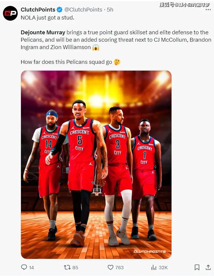 美媒写道:鹈鹕队刚刚得到了一个基石,穆雷可以为鹈鹕带来真正的控球技术+精英防守,他可以成为麦科勒姆、英格拉姆、锡安-威廉森身旁一个额外的得分威胁,鹈鹕下赛季能走得更远。