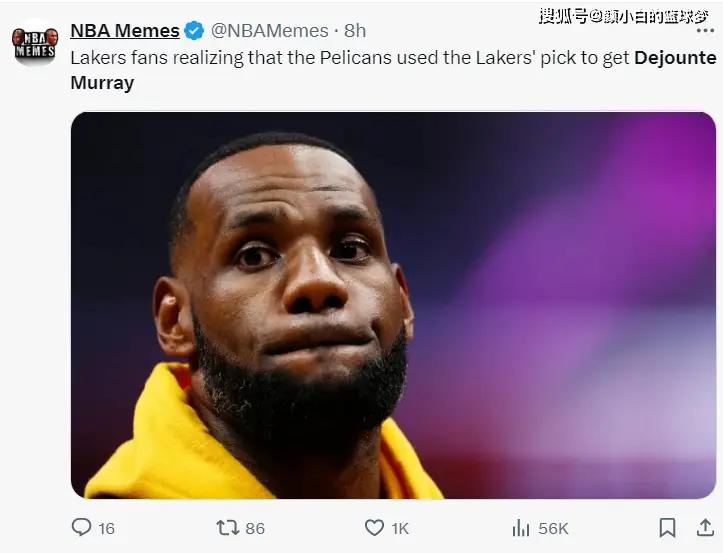 美媒NBA Memes写道:湖人球迷意识到鹈鹕用他们的选秀权得到了德章泰-穆雷。(詹皇沮丧的表情)