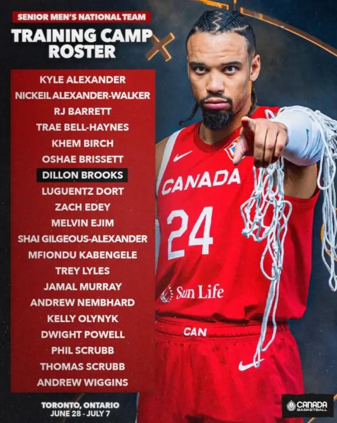 此前加拿大公布了自己2024年巴黎奥运会20人训练营名单,其中包括了12名NBA现役球员,具体名单如下: