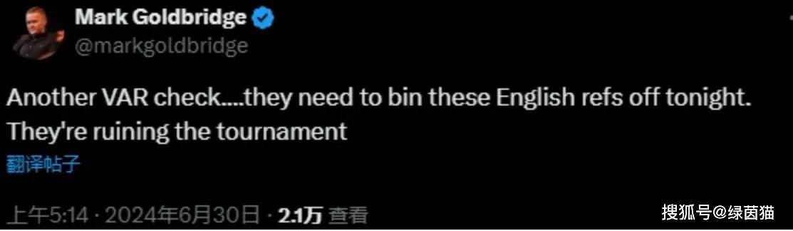 媒体人Mark Goldbridge吐槽:又一次VAR,今天晚上就应该把这些英国裁判解雇,他们毁了这项赛事。