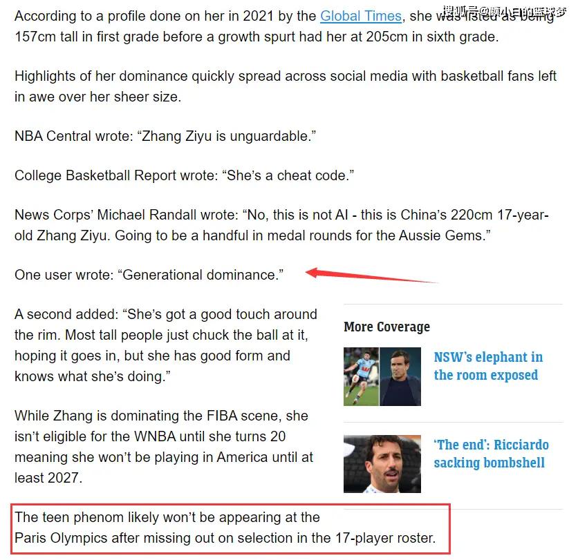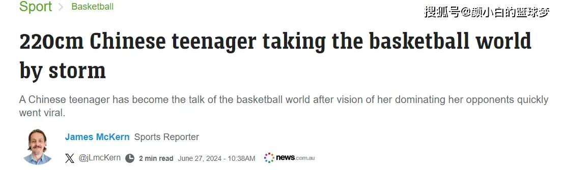 澳大利亚媒体《news.au》撰写长文分析张子宇,文章标题《220厘米的中国少女风靡世界篮坛》,副标题:一位来自中国的篮球少女在亚洲杯舞台打出统治力,她的事迹正在风靡世界。