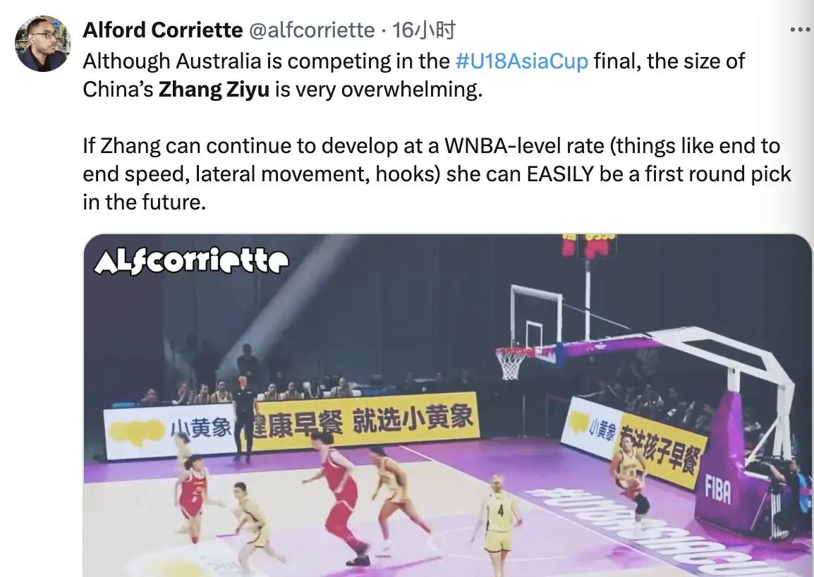 Alford Corriette还认为,“如果张子宇能继续提升,例如奔跑速度、横向移动和勾手等技术能力,她能很容易成为未来的首轮选秀。”