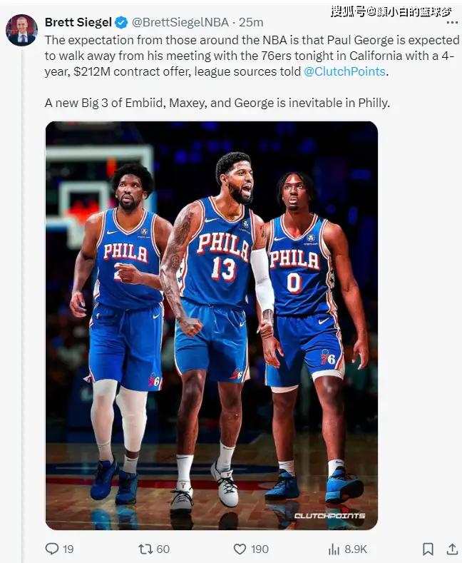 根据有消息人士透露,费城将给乔治一份四年2.12亿的顶薪合同,一个新的三巨头组织不可避免的诞生——恩比德、马克西、乔治。