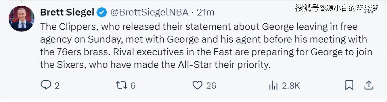 北京时间7月1日,根据NBA记者Brett Siegel的报道,快船已经发布乔治将以自由球员身份离开的声明,在此之后费城管理层与乔治和他的经纪人竞进行了会面,费城已经做好准备签下乔治这位明星球员。