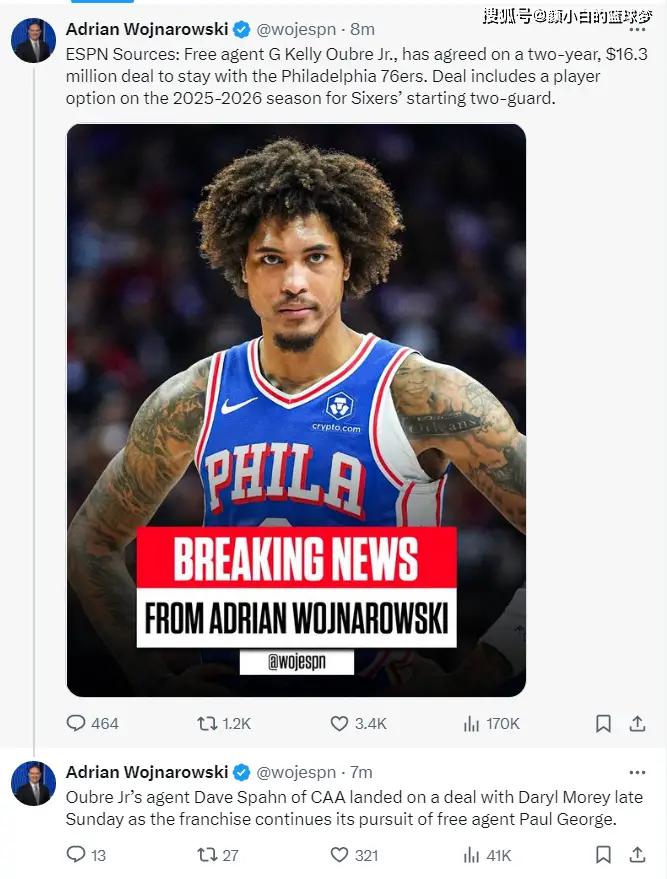 除此之外根据ESPN名记沃神的报道,费城在追逐保罗-乔治的过程中也在继续补强阵容,他们以两年1630万续约了乌布雷。他们的运作都是基于工资帽的运作。