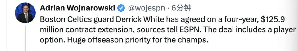 据名记Woj报道,德里克-怀特和绿军达成了一份为期4年价值1.259亿的提前续约合同,帮助球队夺冠之后,怀特也是喜提大合同。