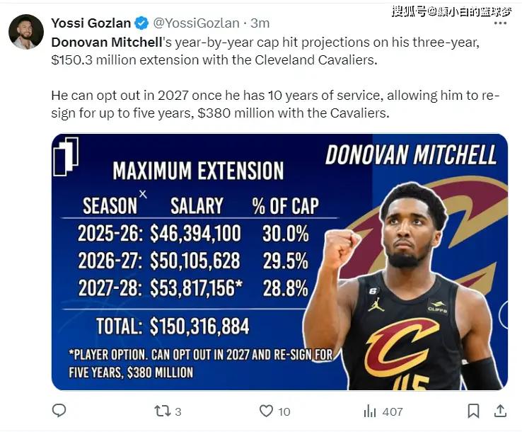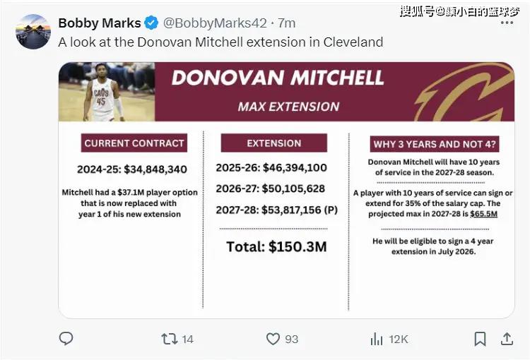 沃神的文中写道:米切尔这份三年1.503亿的续约是MAX续约,其中包含27-28赛季的球员选项。骑士一度为米切尔提供了四年的顶薪合同,因为米切尔没有到达10年的服务标准,他无法获得最大顶薪,他在2027年有希望获得一份超越3.8亿的五年顶薪续约资格。