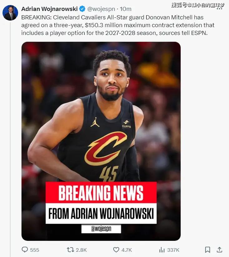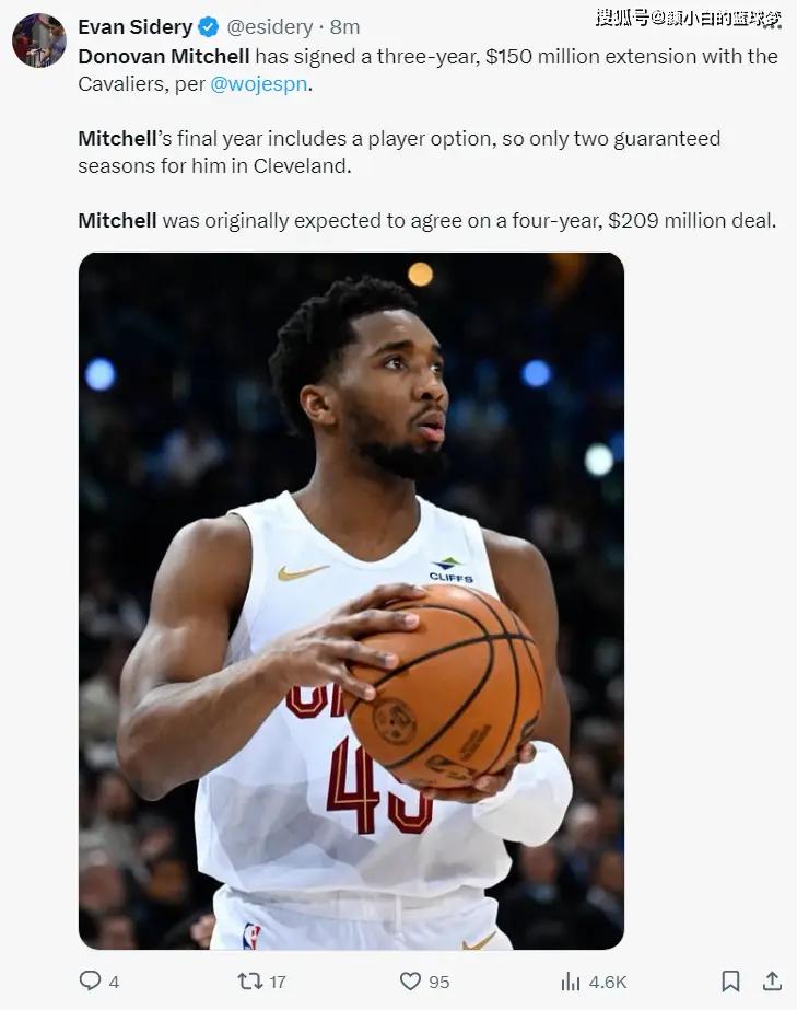 NBA记者埃文-斯迪瑞写道:米切尔只签下三年1.5亿并不是因为他不想要更长的顶薪,骑士已经为他开出了四年2.09亿的续约合同,但米切尔想要未来能赚更多。
