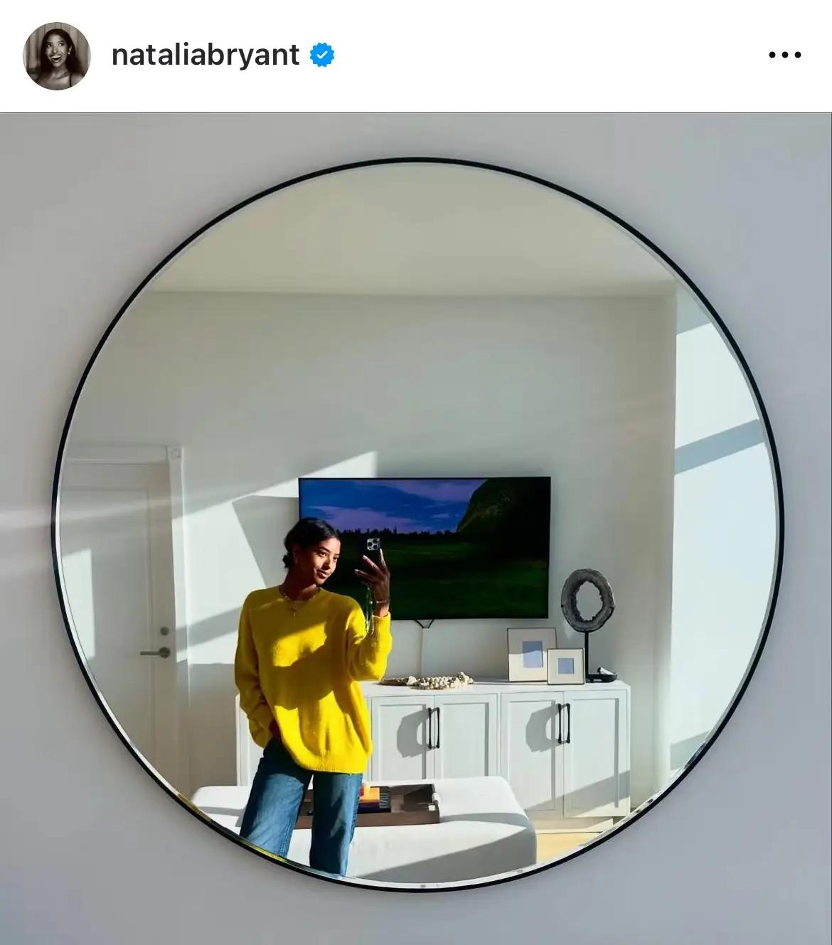 这不?我们在娜塔丽的社交媒体上发现,她经常更新动态来分享自己的生活,其中有一张在圆形镜子面前的自拍。娜塔丽身穿深蓝色牛仔裤搭配黄色毛衣,还戴着一串银色项链,以非常灿烂的笑容完成了自拍。从中我们能够看到娜塔莉已经成功减肥,恢复了往日苗条的身材,因此笑容也才变得更加的自信。
