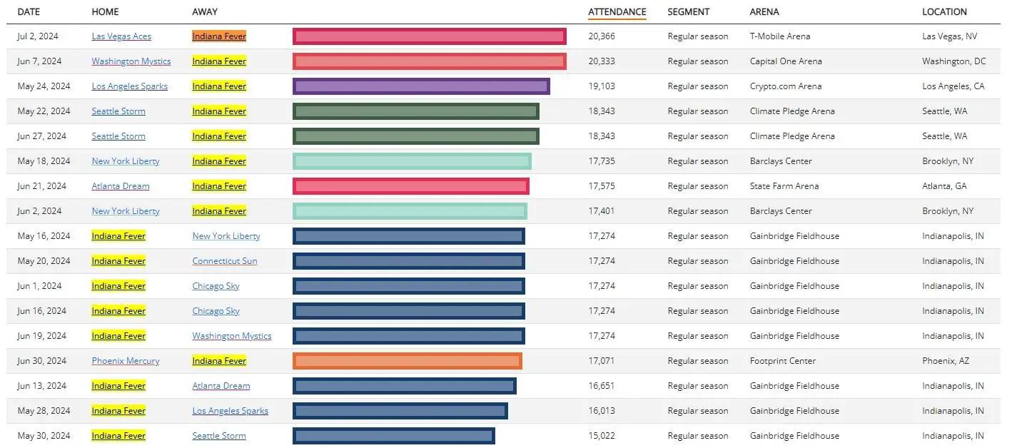 值得一提的是,本赛季现场观众15000+人的比赛,共有17场,其中均有状元克拉克与狂热队的身影。而狂热也成为WNBA历史第一支多次出战,现场观众人数20000+客场常规赛的球队。