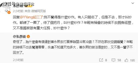 有球迷反驳崔永熙赴美是一次炒作,朱彥碩则是发文补充说道:我不覺得是什麼炒作,有人只報名了,但是不去,那才叫炒作。都練了一圈了,待了個把月,叫什麼炒作?年輕有機會的時候不去親身經歷,又不是國家隊有重大任務,炒什麼作?