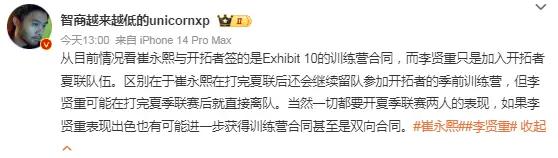 媒体人王健谈到崔永熙和李贤重同时签约开拓者的话题则是发文说道:从目前情况看崔永熙与开拓者签的是Exhibit 10的训练营合同,而李贤重只是加入开拓者夏联队伍。区别在于崔永熙在打完夏联后还会继续留队参加开拓者的季前训练营,但李贤重可能在打完夏季联赛后就直接离队。当然一切都要开夏季联赛两人的表现,如果李贤重表现出色也有可能进一步获得训练营合同甚至是双向合同。