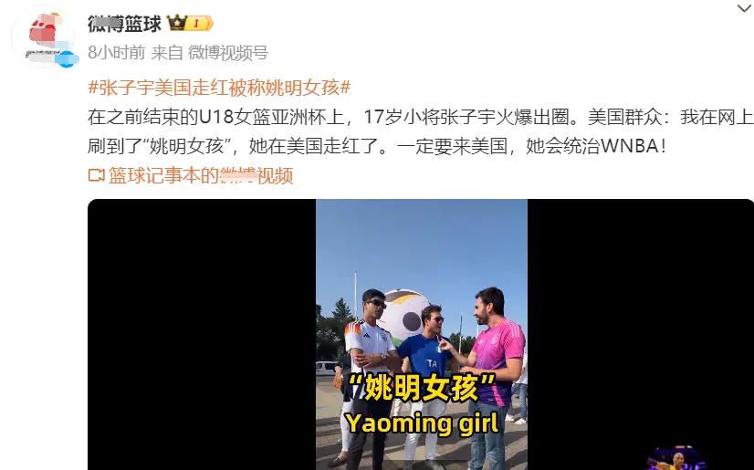 张子宇彻底火了,这下不仅中国球迷知道她的存在。在U18亚青赛比赛结束以后,就连海外球迷也知道张子宇的名字。近日,在海外路人采访中,美国网友在谈到中国球员时,他们竟然众口一致的说起张子宇,认为这个17岁女孩确实太强了,希望她能够早点前往WNBA效力,尽快统治篮球比赛。