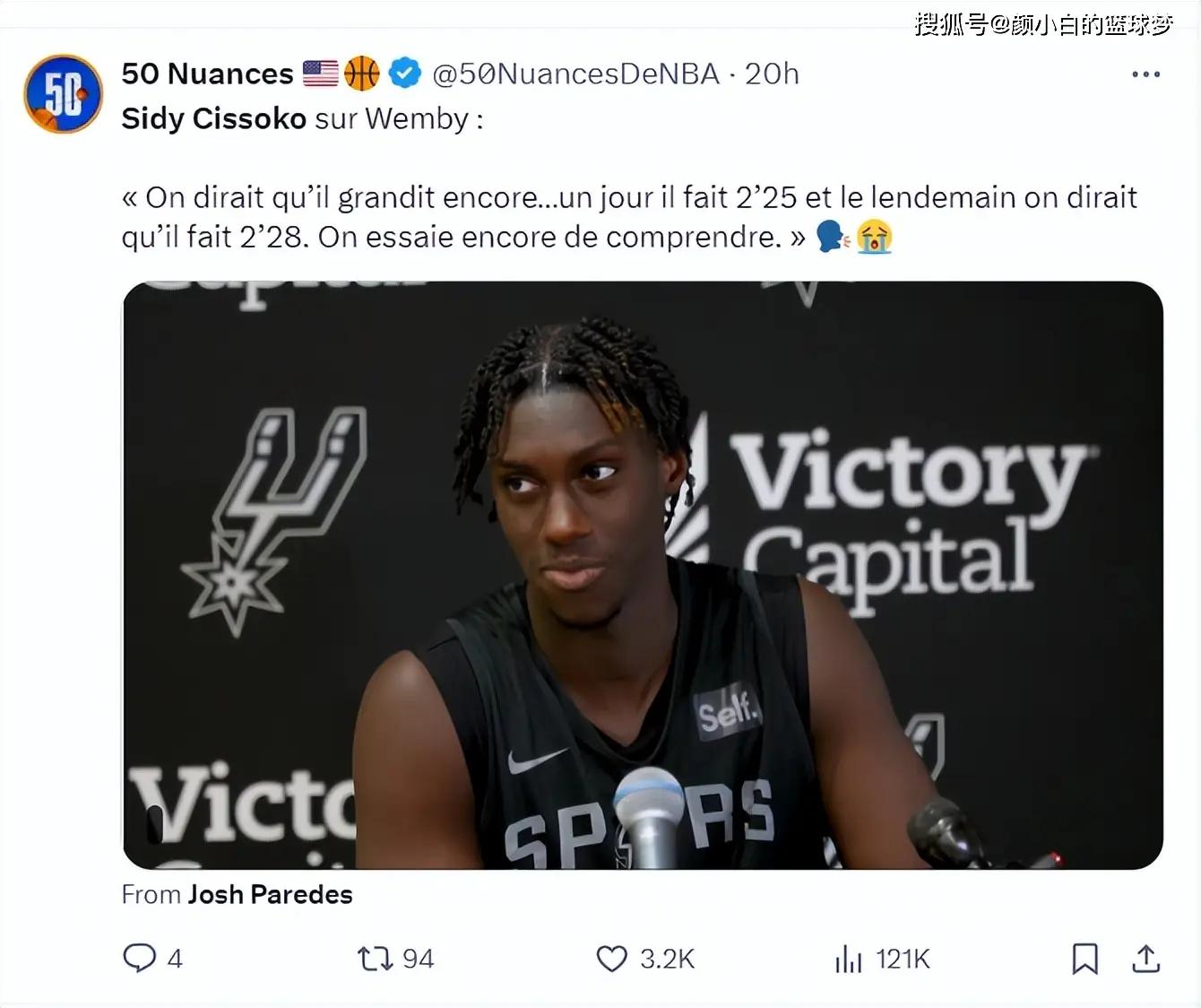 马刺二年级生西迪-西索科在训练后接受媒体访问谈到法国青年队、马刺队友维克多-文班亚马,他表示自己不需要给20斤肌肉给文班,文班亚马已经越来越强壮,而且文班亚马还在长高,之前他可能是7尺3/7尺4,但现在看已经7尺5,我们正在搞清楚他为什么还在长。