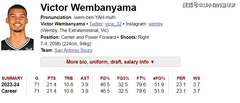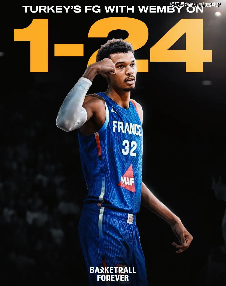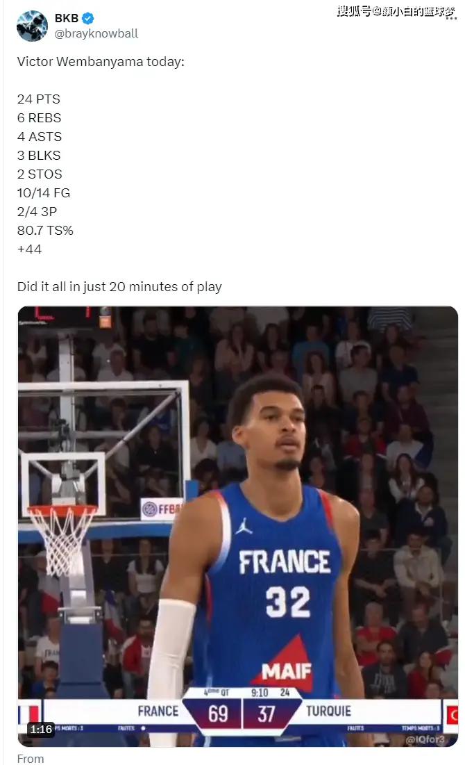 如果文班亚马已经长到7尺5,那么就是2.2606米,这个尺寸太恐怖了,他在巴黎奥运会热身赛面对土耳其,短短19分钟,14中10,三分4中2,拿到24分6篮板4助攻3盖帽2抢断,真实命中率80.7%,正负值+44,简直不要太强。