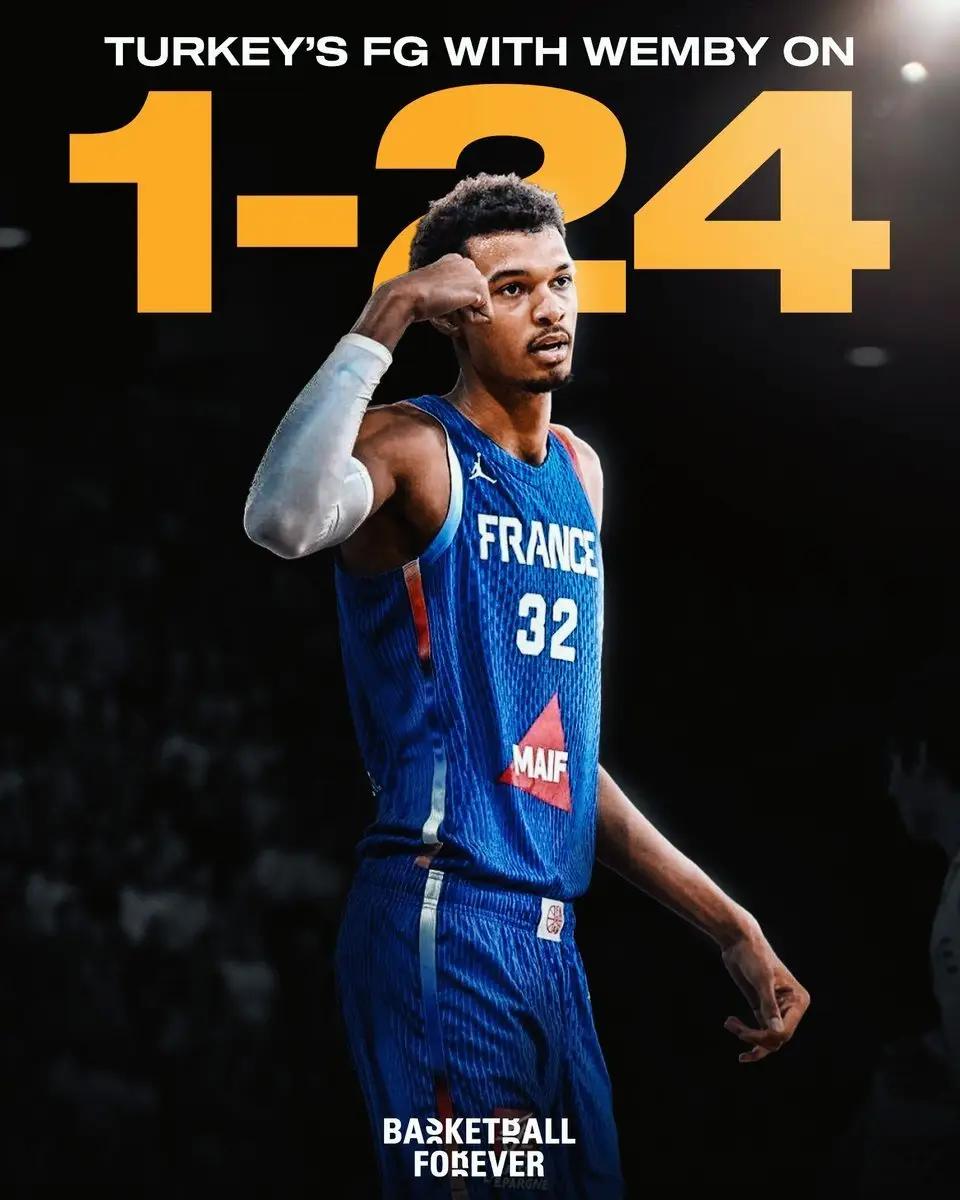 在最近的一场热身赛中,法国男篮94-46狂胜土耳其,展现了强大的实力。文班亚马出战20分钟,14投10中,得到了24分6板4助3帽,正负值为+44。