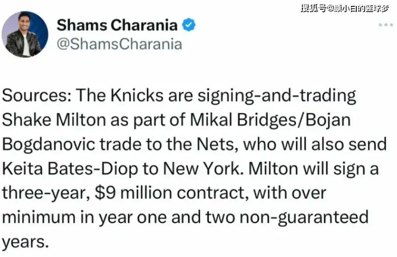 根据Shams的跟踪报道,篮网以三年900万的合同签下米尔顿,第一年略高于底薪,后面两年不保障送往尼克斯配平薪金空间,篮网则将迪奥普打包送到尼克斯。这笔9换3的交易正式达成。