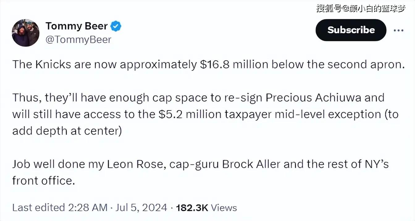 这笔交易达成后,薪资结构专家YossiGozlan透露,尼克斯距离1.889亿的第二土豪线还差1690万,他们还有足够的空间可以续约阿丘瓦,而且还剩一份520万的中产特例可以使用。