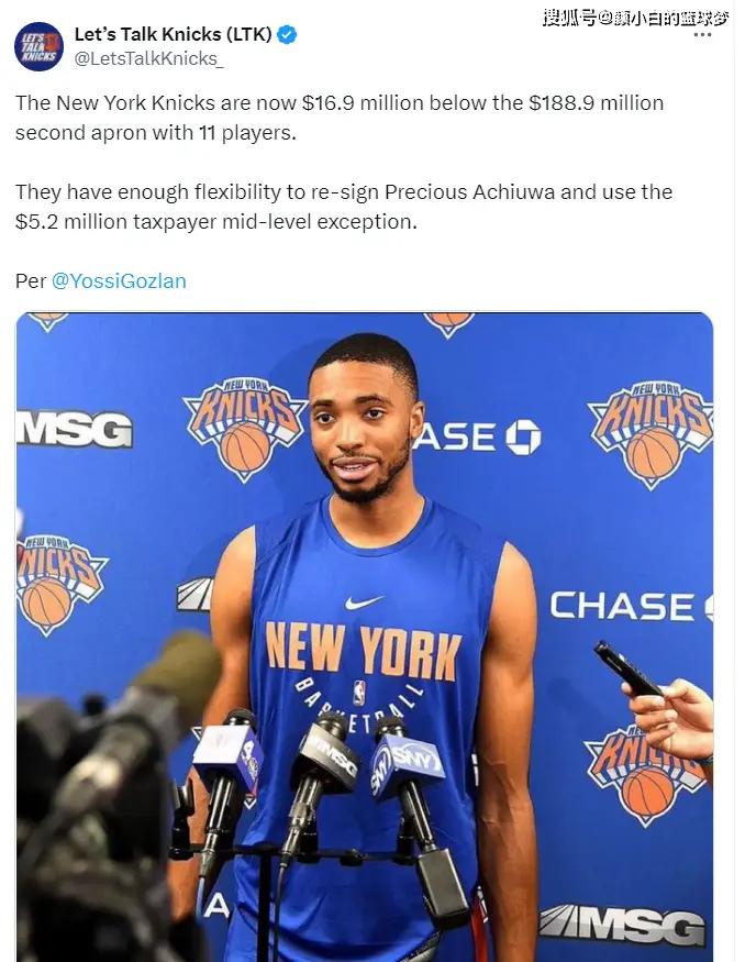 NBA记者Tommy Beer也写道:尼克斯还剩1680万以上的空间来留住阿丘瓦,更是保留了一份520万的中产可以签下自由球员,目前他们大名单上只有12人。