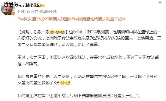 有球迷调侃姚明带领中国篮球抵达澳大利亚交流的计划,除了赤裸裸的4战全败,还有狂输109分的尴尬,中国篮球是否真能匹配澳大利亚的水平?那些在国内联赛打得风生水起的本土球员,为何代表中国队出征就陷入水土不服的状态。