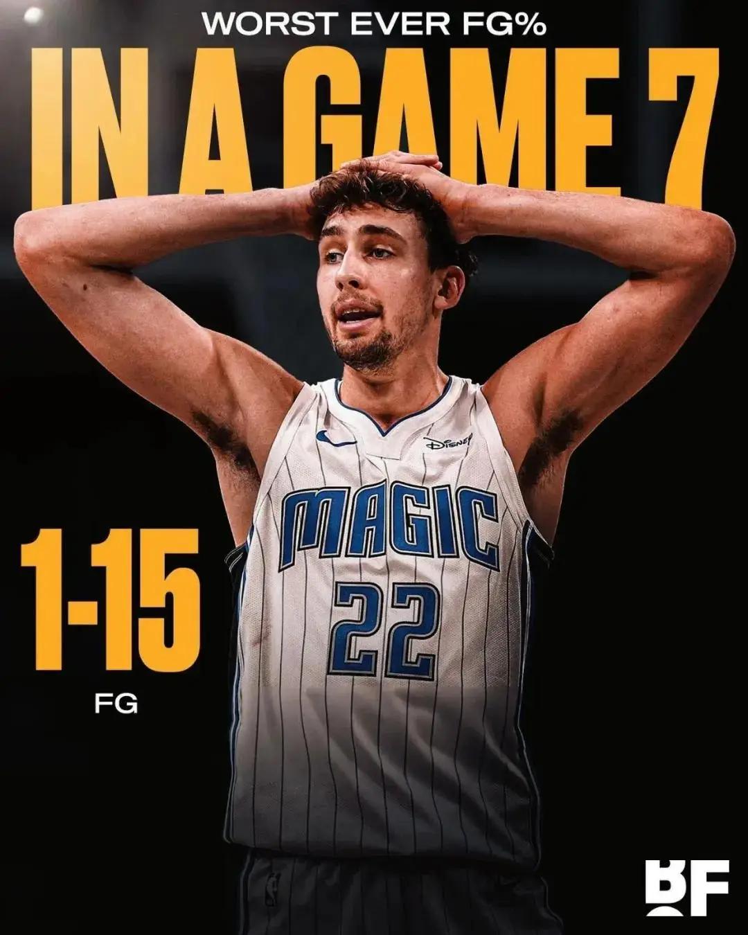 小瓦格纳成为抢七大战历史上,投篮命中率最差的球员(至少出手15次)。系列赛G5到G7,三场关键的比赛,小瓦格纳的三分球合计16中2。但凡小瓦格纳外线准一点,魔术也不至于输掉抢七。小瓦格纳打成这样,魔术竟然不压价?
