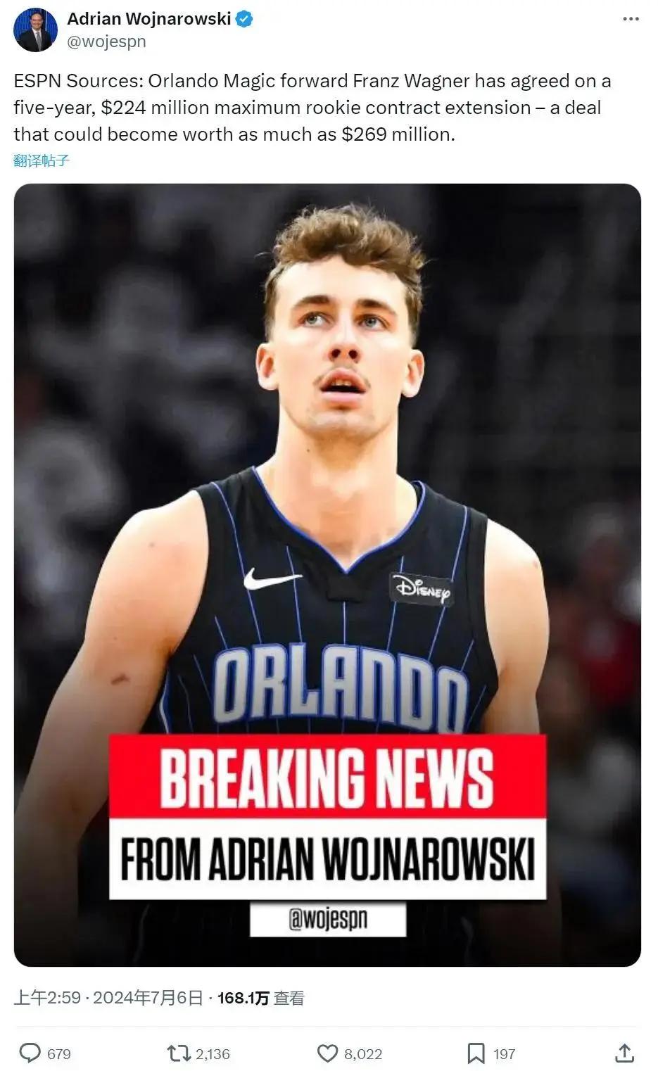 北京时间7月6日,两大名记Shams和Woj报道,奥兰多魔术队和弗朗茨-瓦格纳签下5年2.24亿美元续约合同。如果小瓦格纳下赛季入选最佳阵容,哪怕三阵,合同将达5年2.69亿。这是一份指定新秀条款,跟巴恩斯和康宁汉姆的一样。