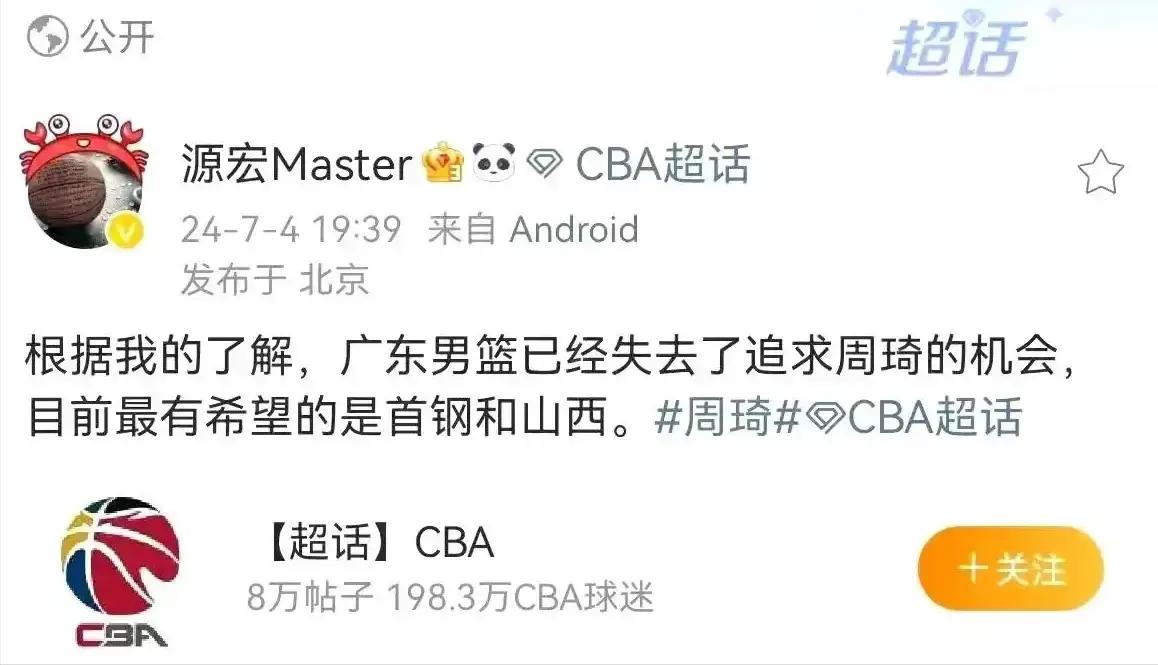 据媒体人源宏Master曝料,广东男篮续约周琦已告失败,尽管广东男篮诚意满满,但由于无法满足周琦超过千万的签字费需求,因此也只能遗憾退出周琦争夺战,等着收取转让费就放人。眼下还在谈判桌上的只剩北京首钢与山西汾酒两家,许利民指导在接受媒体采访时,明确表示首钢需要个内线护框中锋,只差没直接点周琦的名字,山西汾酒虽然周琦未必看得上,但能够给的起高价,所以也一直没离桌。
