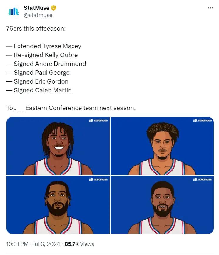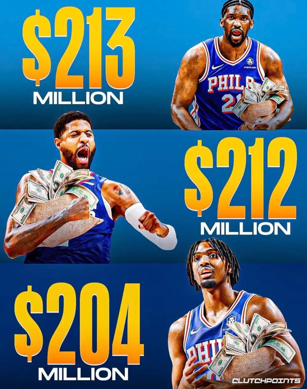 费城已经成为NBA历史上首支拥有三份超2亿合同的球队,乔治四年2.12亿,马克西五年2.04亿,恩比德四年2.13亿。