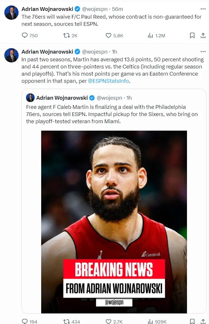 北京时间7月6日凌晨,ESPN名记沃神报道,自由球员凯莱布-马丁与费城76人达成一份四年3200万的合同,他将在新赛季成为费城的先发大前锋搭档恩比德、马克西、乔治,目前费城还在专注提升球队阵容硬实力。