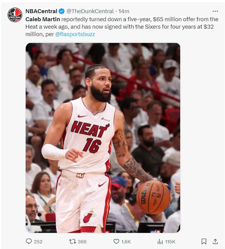 费城这笔签约无疑是赚大了,马丁此前拒绝了热火五年6500万的续约合同,他希望在自由市场上找到均薪1500万的长约,结果步子迈得太大,经纪团队高估了他的身价,没有任何一支球队开价高过热火的均薪1300万,最终只能选择费城。