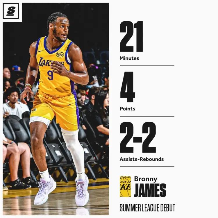 加州夏季联赛洛杉矶湖人队完成首秀,这也是布朗尼身披紫金战袍的首秀,是他第1次为湖人这支联盟第一豪门出战比赛。而最终布朗尼的表现很难称得上精彩,全场9投2中只拿到了4分,正负值全场垫底,命中率是全队垫底,得分是首发最低,全队倒数第二,只进了一个上篮一个中投。尤其是他的中远距离投篮完全失准,只能说詹姆斯应该是没教会他这些,因为全场布朗尼的中远投8次出手就进了1个球,一次上篮倒是命中了。