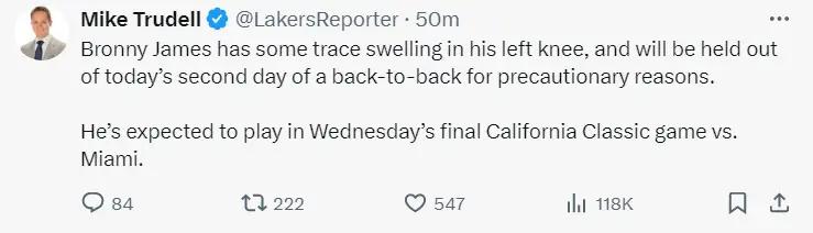 北京时间7月8日,湖人队记迈克-特鲁戴尔报道,布朗尼-詹姆斯因为左膝肿胀缺席背靠背第二场,预计他将在周三参与最后一场对阵热火的夏联比赛,这场轮休是为了预防伤病。
