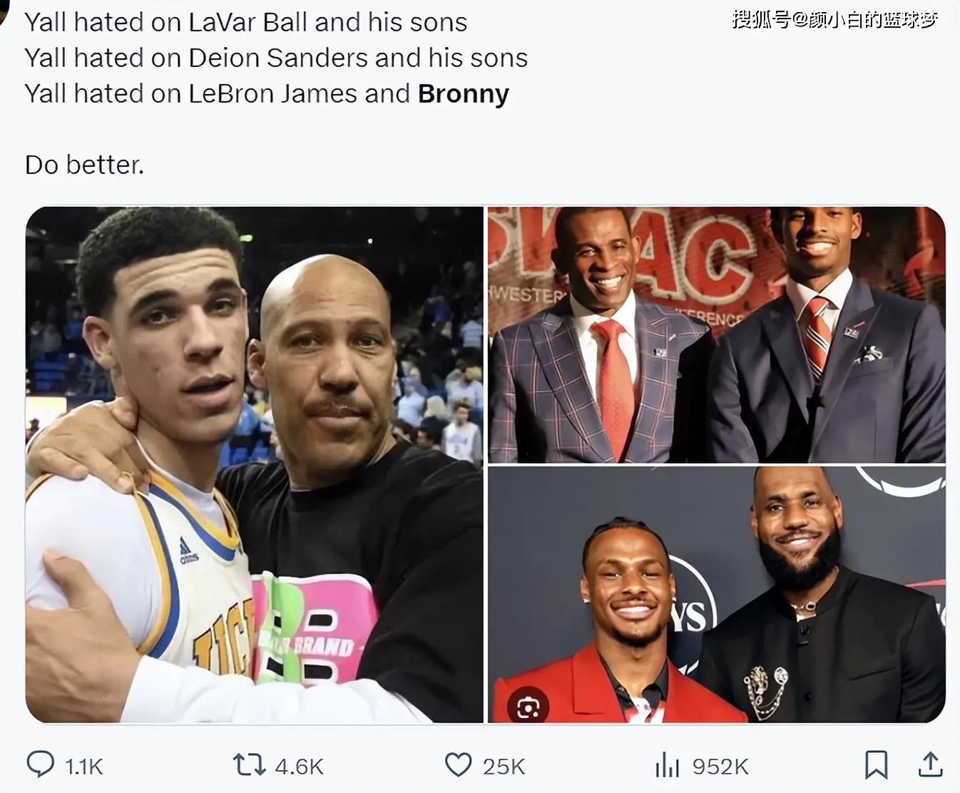 美球迷写道:所有人都厌恶拉瓦尔鲍尔跟他的儿子;所有人都厌恶桑德斯与他的儿子;所有人都讨厌勒布朗詹姆斯与他的儿子。