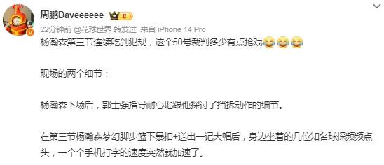 媒体人周鹏则是吐槽50号裁判抢戏为杨瀚森打抱不平,杨瀚森下场后,郭士强指导耐心地跟他探讨了挡拆动作的细节。在第三节杨瀚森梦幻脚步篮下暴扣+送出一记大帽后,身边坐着的几位知名球探频频点头,一个个手机打字的速度突然就加速了。