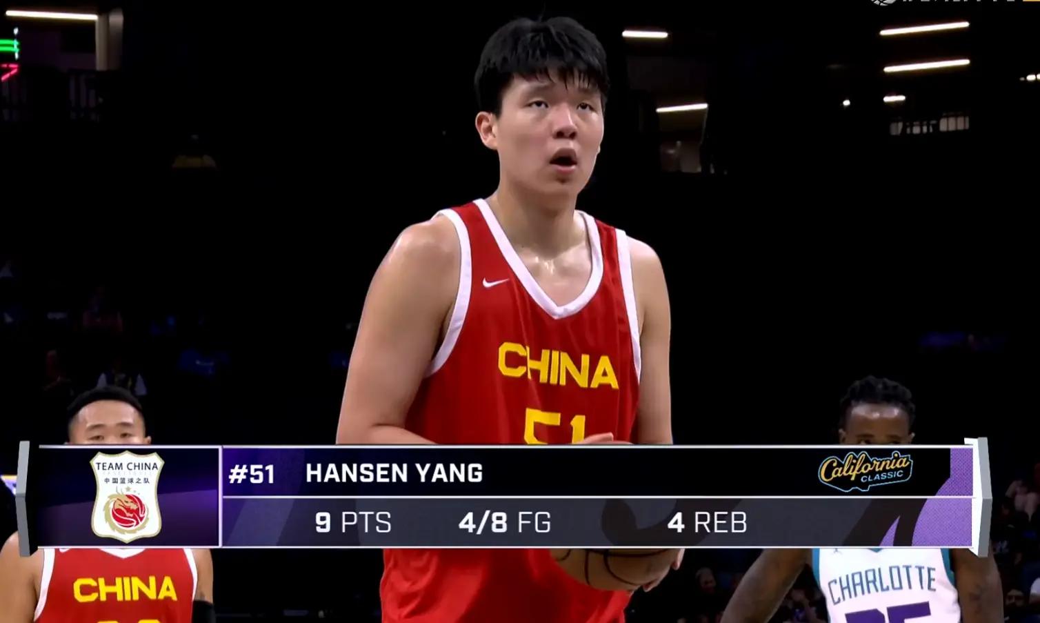 中国男篮本次季前赛又输一场,31分惨败给黄蜂队,不过本场比赛杨瀚森发挥亮眼,砍下了一个非常非常精彩的数据,12分4个篮板。作为男篮全队得分最高的球员,杨瀚森上场之后还是有贡献的,那么在这种情况下,赛后他也是和主教练郭士强一起出席了采访。