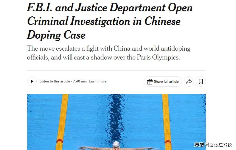 巴黎奥运会马上就要开幕了,中国代表团厉兵秣马,准备出征。然而,近期美国方面却传来了一个对中国队非常不利的消息。来自《纽约时报》的报道称,美国FBI已经开始调查23名涉嫌使用兴奋剂的中国游泳队运动员。