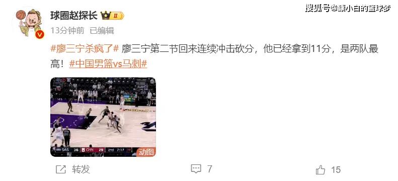 对阵马刺这场应该是中国要打最弱的夏联球队,廖三宁首节4中1,拿到3分1抢断,但第二节廖三宁打疯了,单节7中5,拿到10分2篮板2助攻1抢断,单节10分已经创造夏联得分纪录,半场13分2篮板2助攻2抢断,夏联得分新高了。