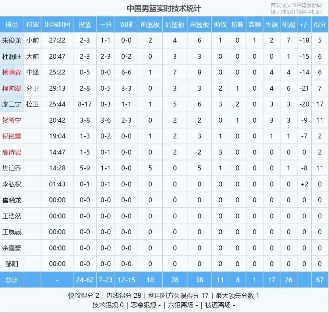 廖三宁17分6板3助,贺希宁11分2板,焦泊乔11分5板,程帅澎7分3板2助,杜润旺6分3板,朱俊龙5分6板。中国男篮打了半场好球,下半场防守强度一上来,连续失误、丢前场板。上半场中国男篮5次失误,下半场12次失误。