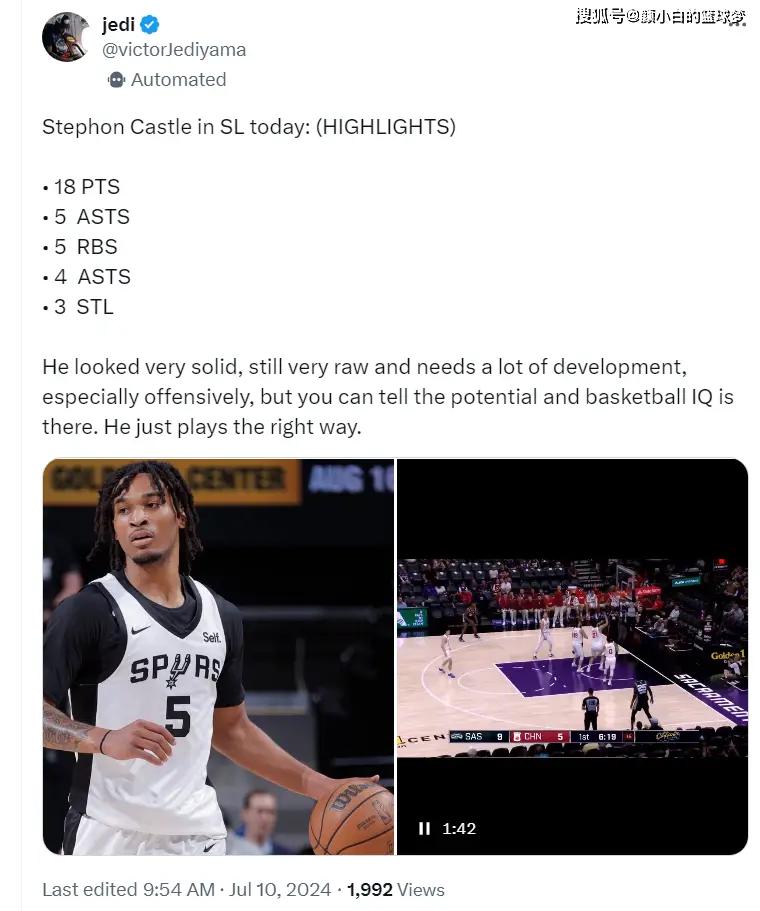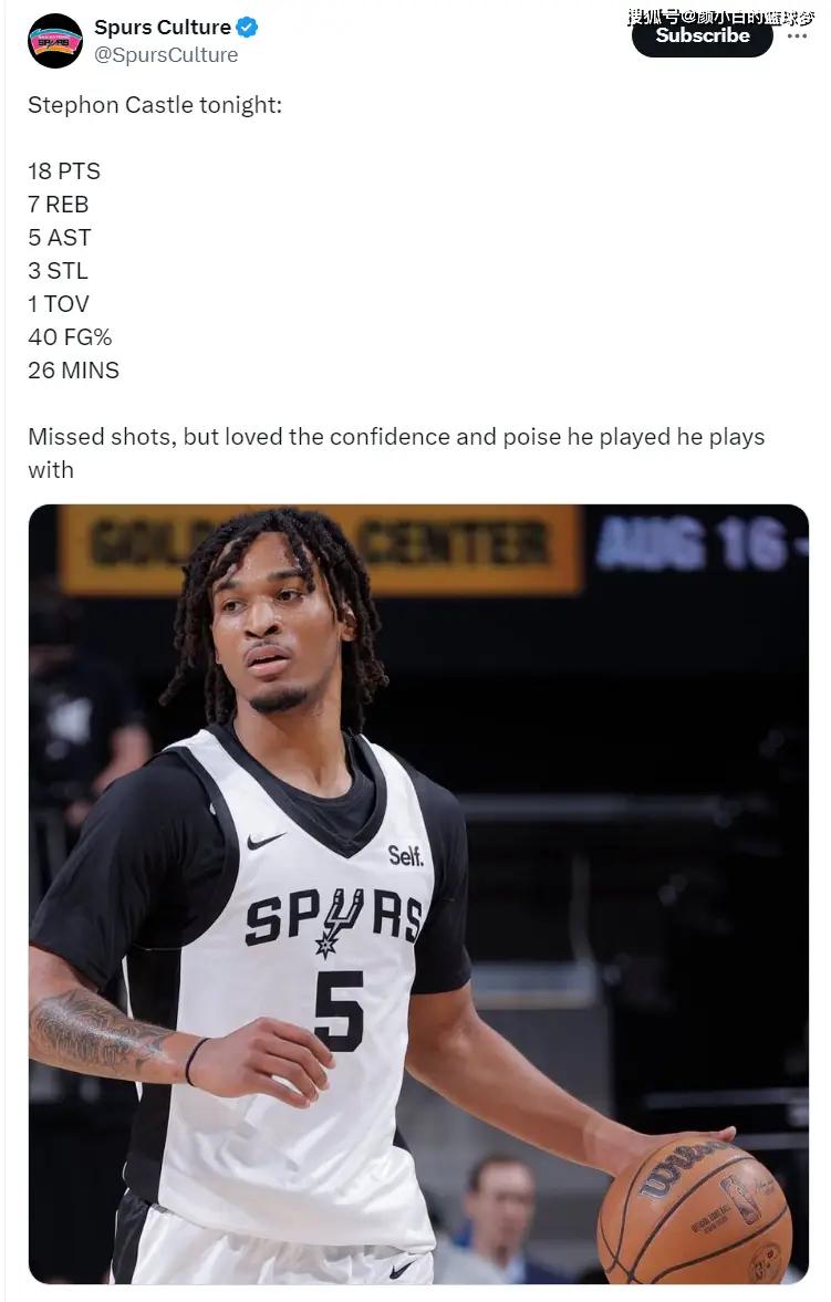 马刺媒体也吹他:卡斯尔是一个传球优先的后卫,他把得分当成第二事业;