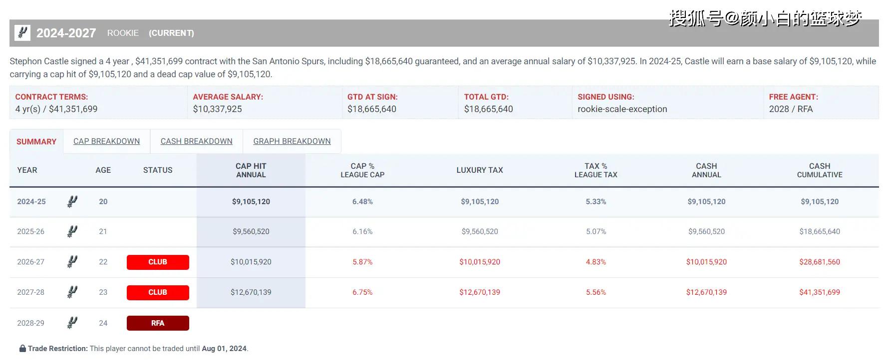 身高1.97米,臂展2.06米的糙汉卡斯尔,四顺位进入NBA刚签下四年4136万的大合同。