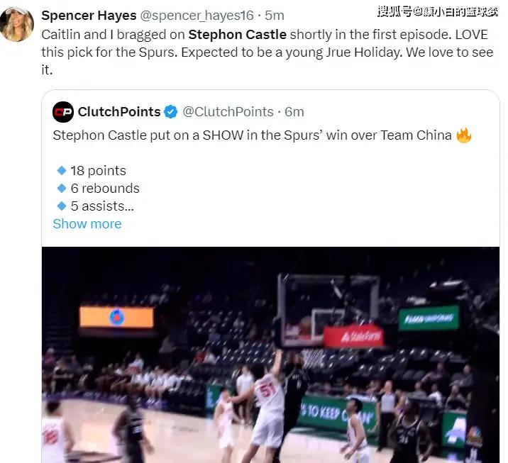 有美国球迷表示:很喜欢马刺选中的卡斯尔,他有年轻霍勒迪的感觉。
