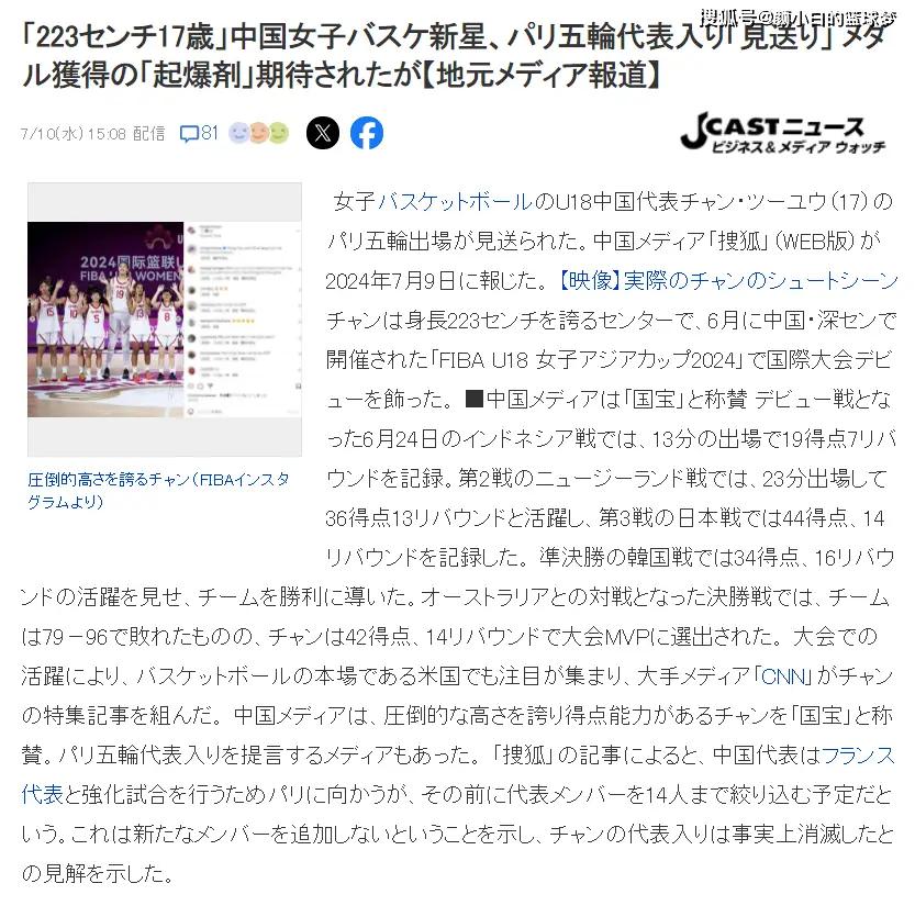 北京时间7月10日,日本媒体《CAST》写道:中国17岁2.23米的篮球新星被期待进入奥运名单,可她已经被排除在14人之外,中国送行了奖牌利器。