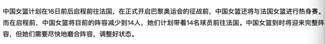 北京时间7月9日,篮协官方又出台一条消息——女篮将在16日前后启程前往法国,出征奥运前还将与法国队打热身赛,启程前女篮大名单会缩减到14人,郑薇只会带14人去法国。